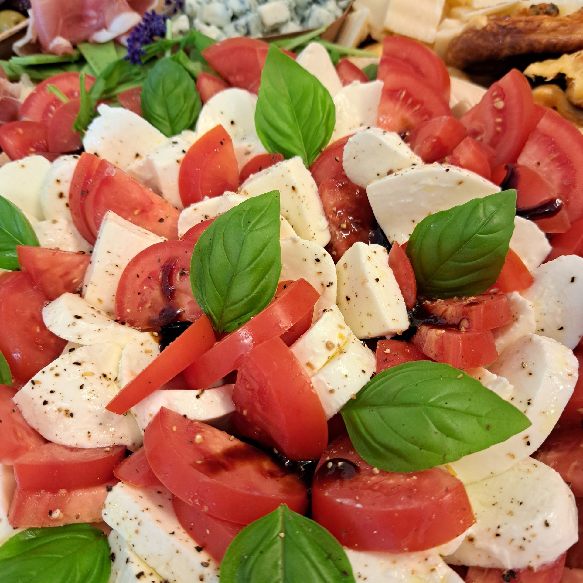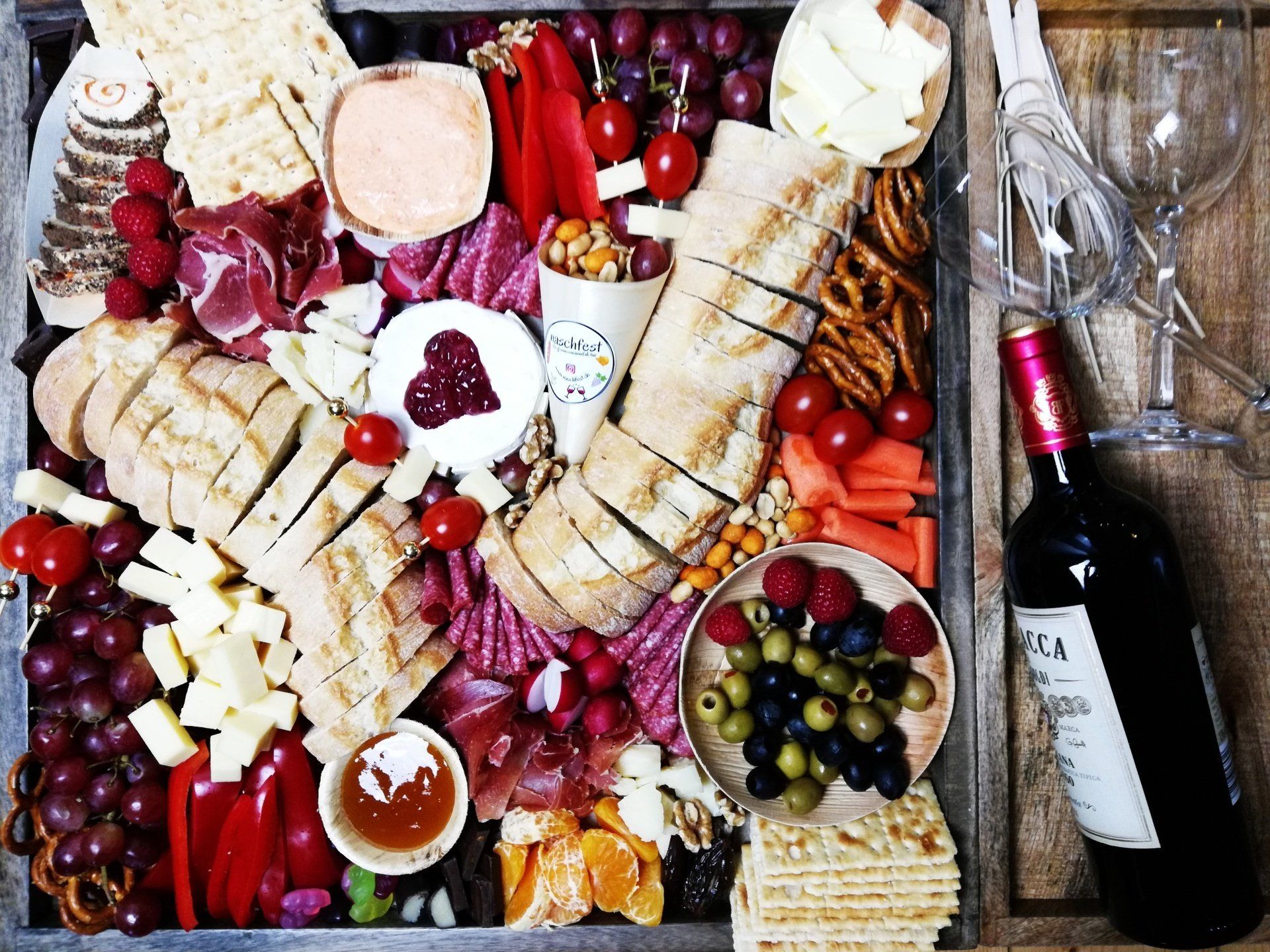 Almkäse, Kaminwurzel, Schwarzwälder Schinken, Leberkäse, Salami, Preiselbeermeerrettich, grobkörniger oder süßer Senf, Obazda aus eigener Herstellung, Laugengebäck, Roggenkrustenbrot, Cracker, Gewürzgurke, Paprika, Tomaten, Trauben